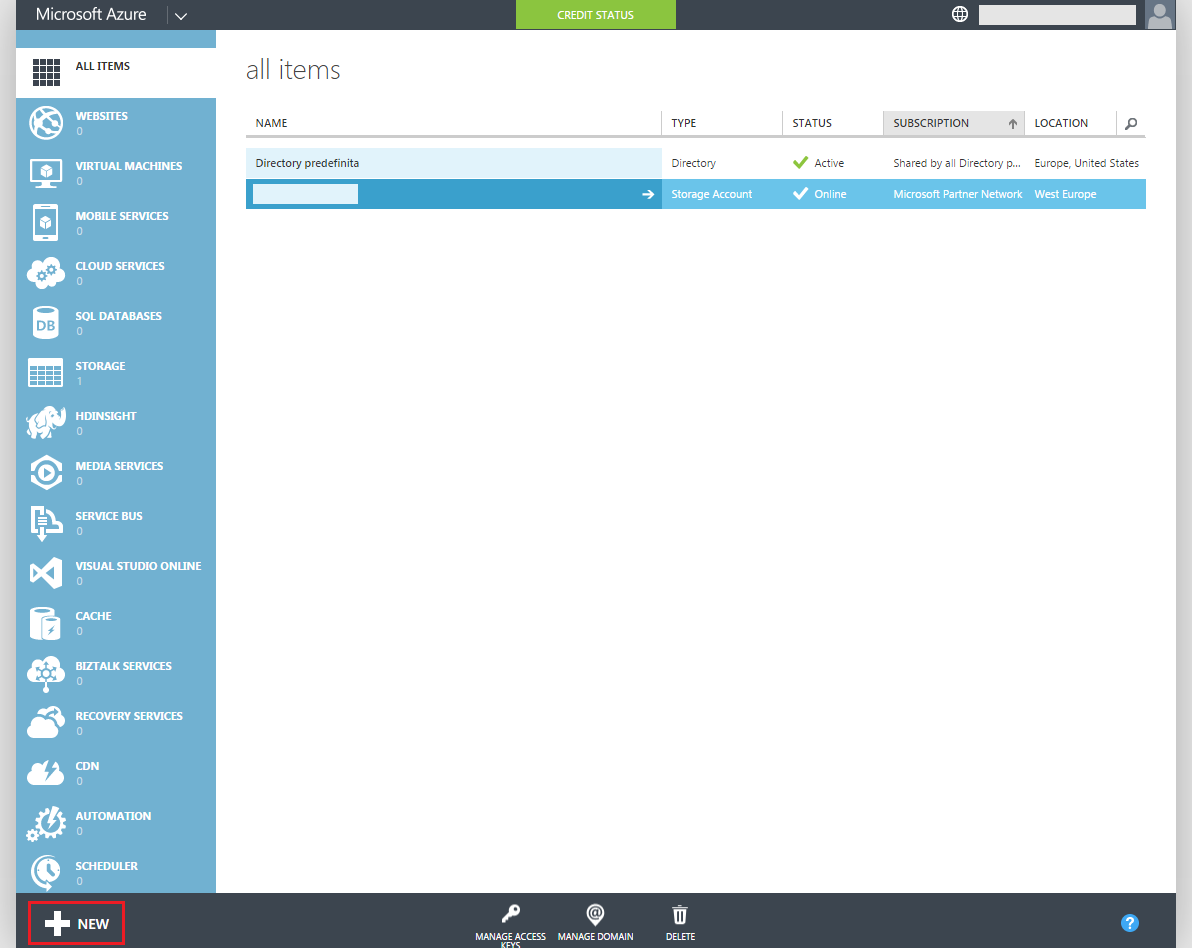 Select Data Services –> Storage –> Quick Create. Specify the name of your object storage account (used for the domain), the datacenter location and the desired redundancy: